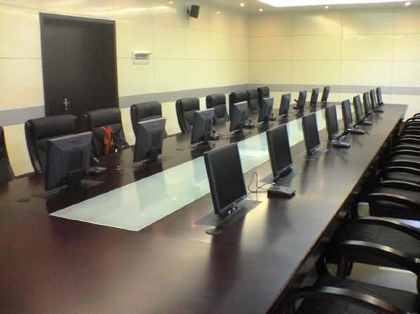 當需要舉行會議時隱藏在會議桌內(nèi)的升降器把液晶顯示器從會議桌下面自動升到桌面并仰成一定角度,